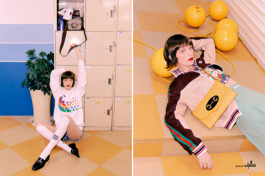 (왼쪽) GUCCI 무지개에서 별이 떨어지는 모습을 표현한 스웨트셔츠, 빈티지풍의 디스트로이드 데님 쇼츠, 블랙 자카드 장식의 화이트 니삭스, 홀스빗 장식의 모카신, 플라워와 크로스 모티브의 드롭 이어링, 캐비닛에 담겨 있는 그린과 레드, 날렵한 라인이 매력적인 웹 디테일의 롸이톤 스니커즈, 미니 사이즈의 구찌 홀스빗 1955 GG 수프림 캔버스 숄더백.