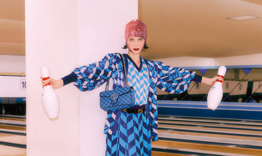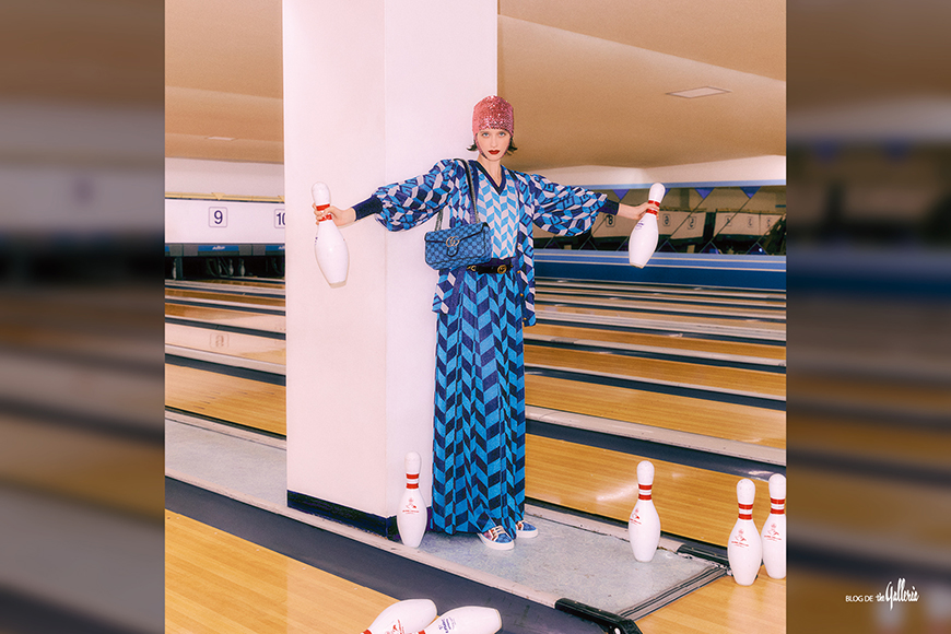 GUCCI 지오메트릭 GG 스티치가 돋보이는 자카드 피케 카디건과 이너로 매치한 베스트, 올오버 자카드 피케 롱스커트, 인터로킹 G 디테일이 인상적인 블랙 가죽 체인 벨트, 사랑스러운 핑크 시퀸 보닛, 더블 G 장식과 다크 블루 트림이 조화를 이룬 GG 멀티컬러 패턴의 GG 마몽 라이트 블루 캔버스 스몰 숄더백, 웹 디테일의 구찌 테니스 1977 GG 멀티컬러 스니커즈.