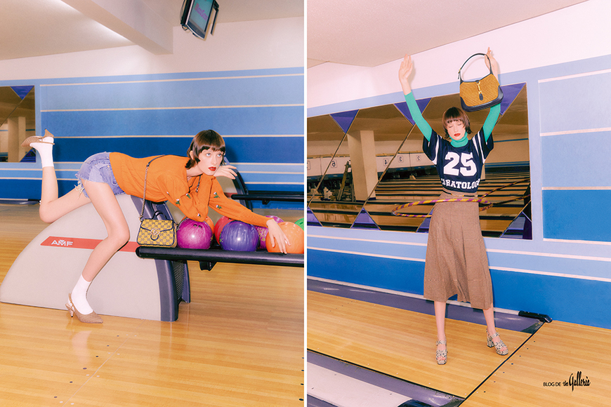 (왼쪽) GUCCI 플라워 자수 장식의 울 소재 니트 톱, 빈티지한 디스트로이드 데님 쇼츠, 미니 GG 수프림 캔버스 디테일이 특징인 더스티 브라운 미드 힐 슬링백, 함께 레이어링한 화이트 코튼 삭스, GG 멀티컬러 패턴으로 이뤄진 스몰 사이즈의 GG 마몽 옐로 캔버스 톱 핸들 백.
