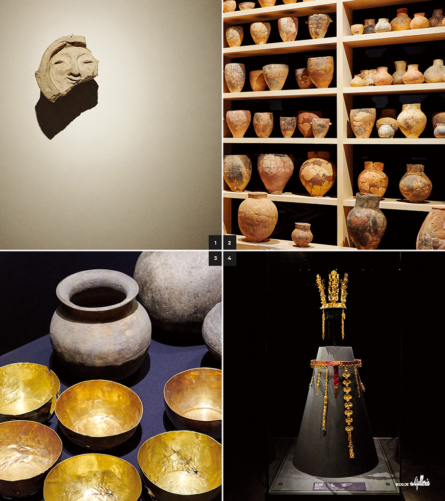 1. 얼굴무늬 수막새. 신라를 대표하는 얼굴이다. 2. 국립경주박물관에 전시된 신라시대 토기들. 흙의 질감이 소박하다. 3·4. 금으로 만든 그릇을 비롯해 천마총의 금관까지, 신라인들의 금붙이 사랑은 대단했다.