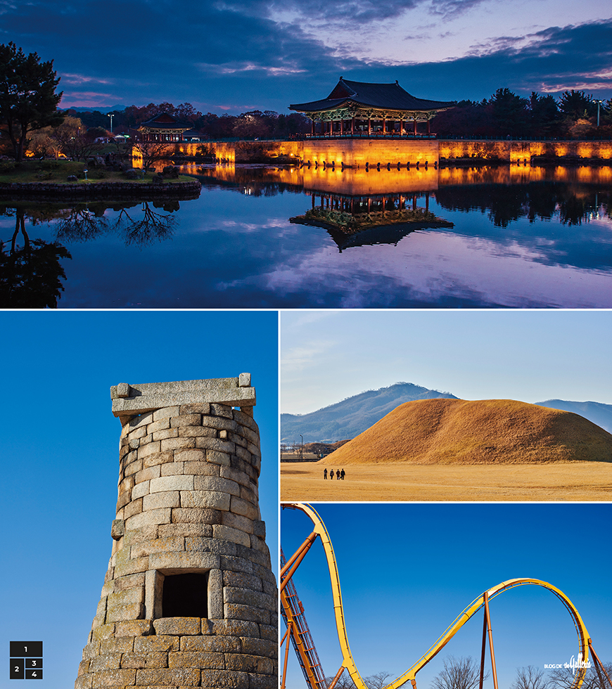 1. 동궁과 월지(안압지)의 아름다운 야경. 2. 단정하고 풍만한 첨성대의 선. 3. 파란 하늘 아래 드러난 대릉원 고분의 굴곡. 4. 경주의 또 다른 굴곡은 다름아닌 경주월드의 그것이다.