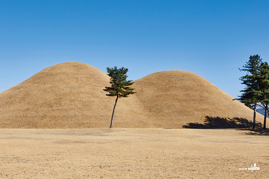 둥글고 봉긋한 능, 버선코처럼 가뿐하게 올라간 기와지붕, 단정하게 쌓아 올린 첨성대와 태양을 등진 석가탑의 굴곡. 어른의 눈으로 좇은 경주는 그야말로 실루엣의 도시입니다. 땅 위 모든 것들이 하늘 아래 겸손히 자세를 낮춘 경주에서는 어디에서 있든 능선과 직선, 곡선을 발견할 수 있습니다. 높고 네모난 빌딩들이 하늘을 촘촘하게 가려버리면 도시의 선을 눈으로 좇기가 힘들지요. 경주의 모습이 새삼 달라 보인다면 당신의 시선이 얼마나 오랫동안 대도시에 머물러왔는지 알 수 있습니다. 경주 시내에서 가장 자주 볼 수 있는 선은 아무래도 담장 너머로 올록볼록 모습을 드러낸 대릉원 고분의 곡선입니다.