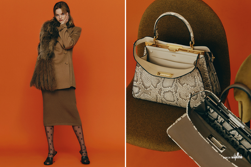 (좌) FENDI 라이트 브라운 컬러의 베이비 캐멀 헤어 소재 피코트, 셀러리아 스티칭 모티브를 장식한 캐시미어 소재의 하이웨이스트 펜슬 스커트, 업사이클 폭스 퍼를 사용한 오버사이즈 모헤어 스카프, FF 칼리그라피 모티브 패턴의 타이츠, 사선 F 형태로 조각한 굽이 인상적인 펜디 퍼스트 샌들.