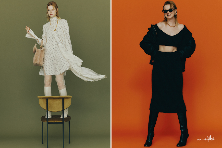 (우) FENDI FF 칼리그라피를 하나의 패턴으로 완성한 시어링 재킷, 모헤어 소재의 오프숄더 피셔맨 립 니트 톱과 미디스커트, 블랙 컬러에 FF 칼리그라피 모티브를 포인트로 장식한 송아지 가죽 부츠, 펜디 오벌 클립 디테일의 펜디 오’락 초커, 양쪽에 하나씩 착용한 라지 사이즈의 펜디 오’락 싱글 이어링과 크리스털 장식을 가미한 펜디 오’락 싱글 이어링, 사선 커팅이 돋보이는 캐츠 아이 선글라스.