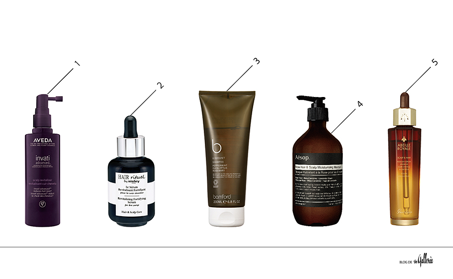 1. AVEDA 모발이 두껍고 풍성해 보이게 하고 두피에 활력을 선사하는 집중 케어 에센스. 아베다의 ‘인바티 어드밴스드 스칼프 리바이탈라이저’, 150ml 8만5천원. 2. SISLEY 원하는 부위에 소량 도포한 후 손가락으로 마사지하면 두피에 에너지를 공급하고 모발에도 힘이 생겨 본연의 모발 색까지 보호하는 시슬리의 ‘리바이탈라이징 포티파잉 세럼’, 60ml 21만원. 3. BAMFORD 두피와 모발을 순하고 부드럽게 클렌징하고, 에센셜 오일 블렌드가 심신을 안정시키며 두피의 유수분 밸런스를 맞춰주는 뱀포드의 ‘비 바이브런트 샴푸’, 200ml 3만7천원. 4. AĒSOP 두피와 모발에 식물성 추출물을 비롯해 토코페롤과 베타카로틴 같은 영향 성분을 공급해 부드럽고 윤기 나는 헤어로 가꿔주는 이솝의 ‘로즈 헤어 앤 스칼프 모이스처라이징 마스크’, 500ml 11만5천원. 5. GUERLAIN 다이내믹 블랙비 리페어 테크놀로지가 외부 자극으로부터 두피와 모낭을 보호하고 활력을 선사해 모발이 안정적으로 자랄 수 있게 돕는 겔랑의 ‘아베이 로얄 헤어 앤 스칼프 유스 오일 인 세럼’, 50ml 19만8천원대.