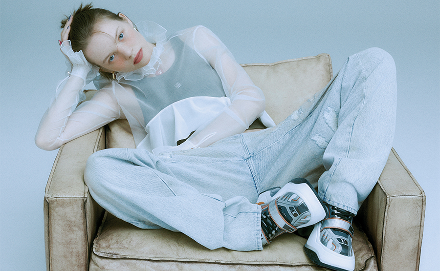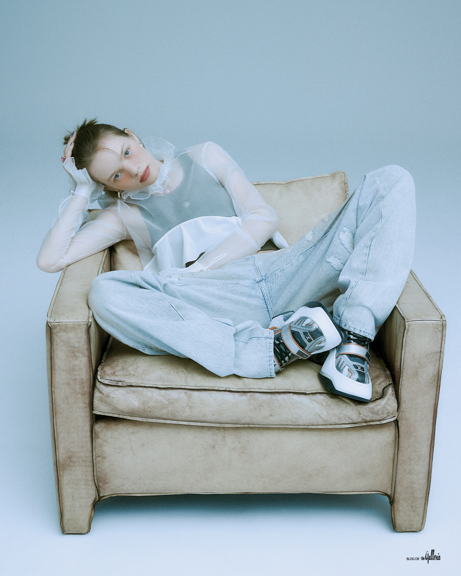 GIVENCHY 크롭트 디자인의 시스루 러플 블라우스, 이너로 매치한 카키 탱크톱, 오버사이즈 디스트로이드 데님 팬츠. LOUIS VUITTON 로봇을 연상시키는 미래적 디자인의 스니커즈. COS 안쪽을 핑크로 코팅한 오벌 후프 이어링. CHANEL 사랑스러운 하트 펜던트 진주 네크리스와 링.