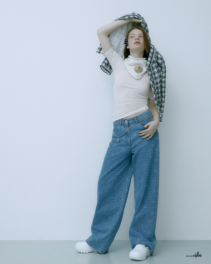 CHANEL 볼드한 체크 트위드 재킷, 로고와 토트 패턴을 프린트한 데님 팬츠, 진주 리본 헤어핀, 벨트로 연출한 자물쇠 모양의 롱 네크리스. COS 부드러운 울 소재 니트 톱. BARRIE 양자리 모티브를 매치한 캐시미어 스카프. BOTTEGA VENETA 도톰한 디자인의 러버 플래쉬 클로그.