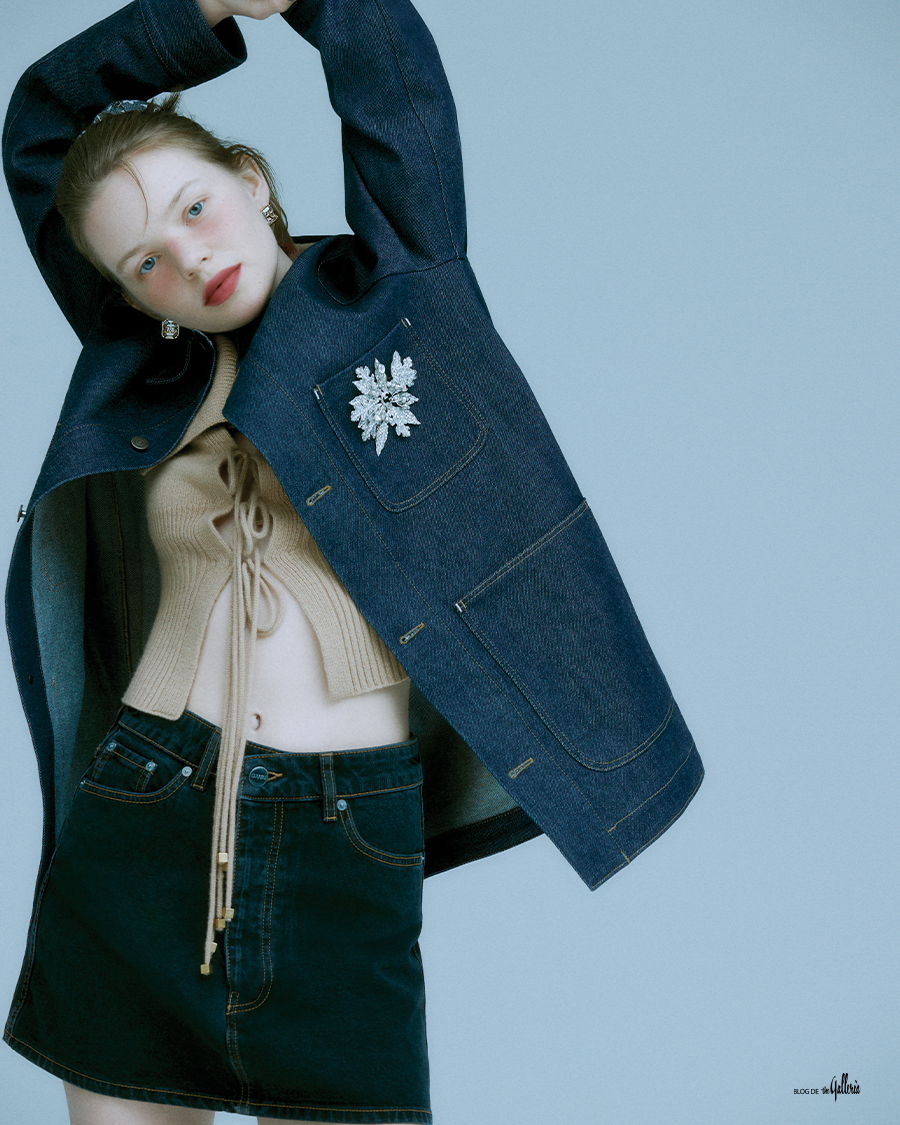 MAISON MARGIELA 재킷으로도 연출할 수 있는 오버사이즈 데님 셔츠. BLUMARINE 기다란 리본 클로저 포인트의 와이드 칼라 카디건. GANNI by BEAKER 말끔한 인상의 인디고 데님 미니 스커트. VALENTINO GARAVANI 팔각형의 크리스털 스터드 이어링. GUCCI 눈꽃을 연상시키는 잎사귀 모티브의 브로치. LOUIS VUITTON 그레이 데님 스크런치.