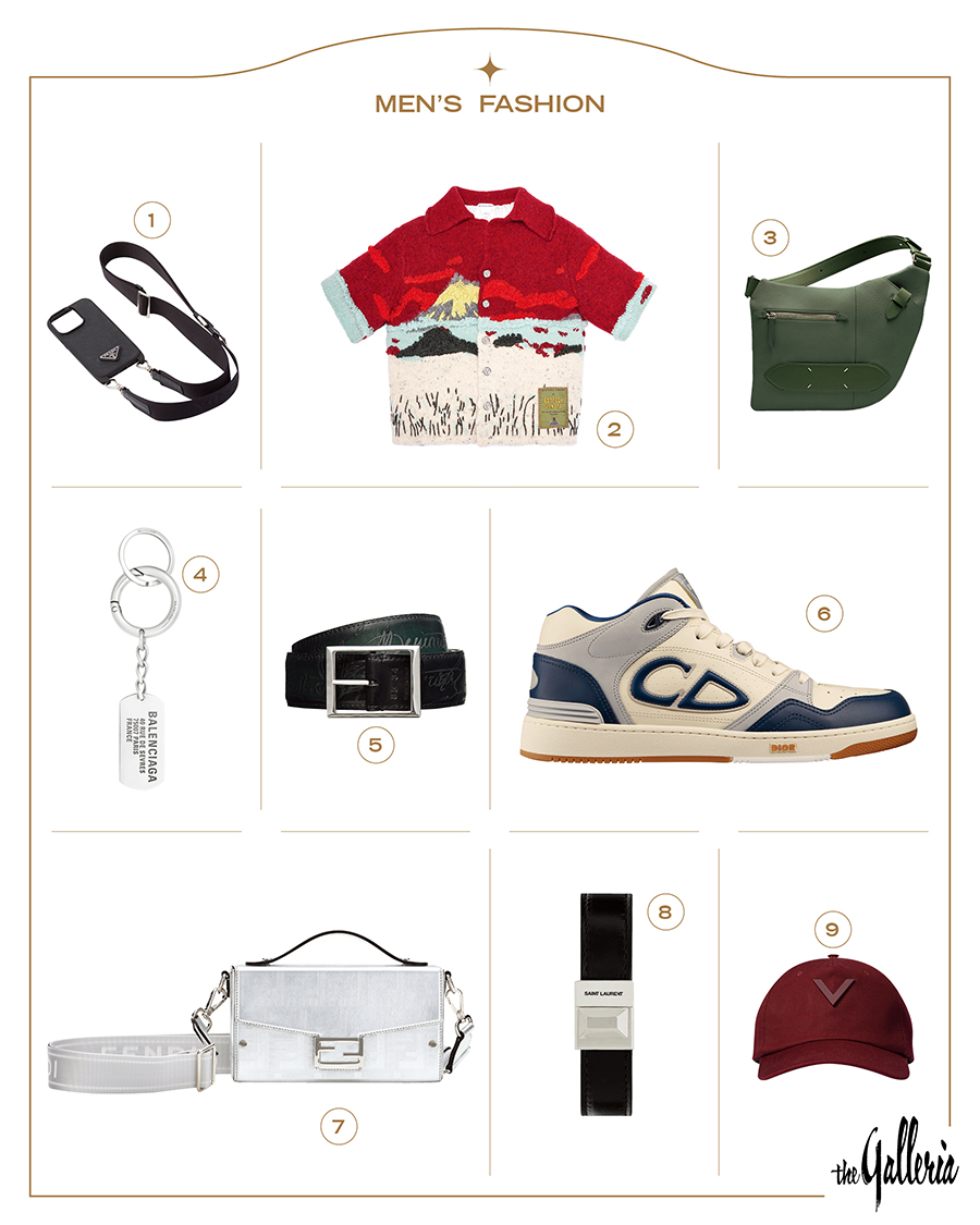 1.PRADA 카드 슬롯이 있어 실용적인 사피아노 가죽의 폰 케이스. 1백3만원 WEST 4F 02.6905.3780 2.BOTTEGA VENETA 핸드메이드로 이국적인 풍경을 수놓은 인타르시아 울 소재 셔츠. 6백33만원대 EAST 2F 02.515.2717 3.MAISON MARGIELA 상징적인 화이트 스티치 디테일로 멋을 더한 소프트 5AC 온보디 백. 2백3만원대 EAST 3F 02.6905.3556 4.BALENCIAGA 로고 인그레이빙 장식의 앤티크 실버 브라스 소재 키링. 40만원대 WEST 4F 02.3446.9262 5.BERLUTI 그날의 룩에 따라 리버시블로 착용할 수 있는 두 가지 색상의 가죽 벨트. 1백43만원 WEST 4F 02.547.1895 6.DIOR 측면에 시그니처 ‘CD’ 장식으로 포인트를 준 멀티컬러 미드 톱 스니커즈. 가격 미정 WEST 4F 02.518.8484 7.FENDI 스트라이프 텍스처의 ‘FF’ 모티브를 매치한 소프트 트렁크 바게트 백. 2백만원대 WEST 4F 02.6905.3717 8.SAINT LAURENT BY ANTHONY VACCARELLO 로고 각인의 스퀘어 플레이트와 블랙 카프스킨 스트랩이 조화를 이룬 브레이슬릿. 72만원 WEST 4F 02.6905.3924 9.VALENTINO GARAVANI 큼지막한 브이로고 장식을 톤온톤으로 맞춘 볼캡. 76만원 EAST 4F 02.6905.3610